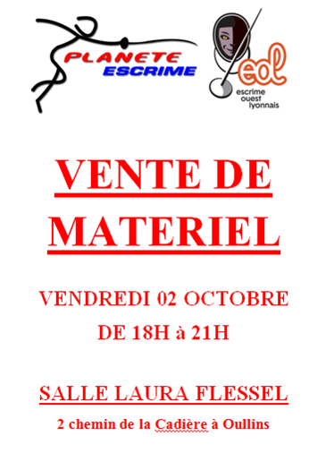 Le club organise une vente de matériel le 2 Octobre de 18h à 21h à notre salle à Oullins.
